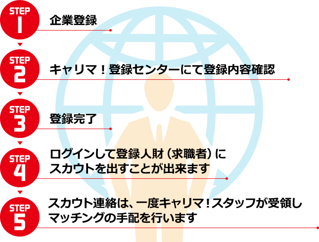 キャリマ!に求人情報をご登録いただくと 海外人財のデータベースに簡単にアクセスできます。 キャリマ!に登録している外国人財に スカウトを出すことが出来ます。